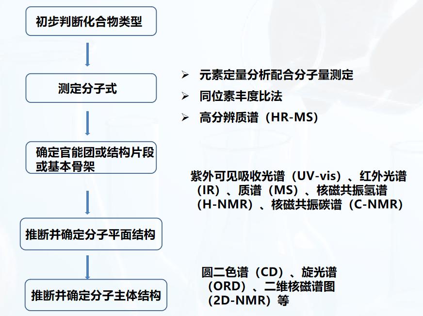 主要方法有傅里叶变换红外光谱仪、高分辨质谱、X射线荧光光谱分析仪、核磁一维(氢谱,碳谱,DEPT135)、核磁二维(HMBC,HSQC, HHCOSY,NOESY)以及数据解析;