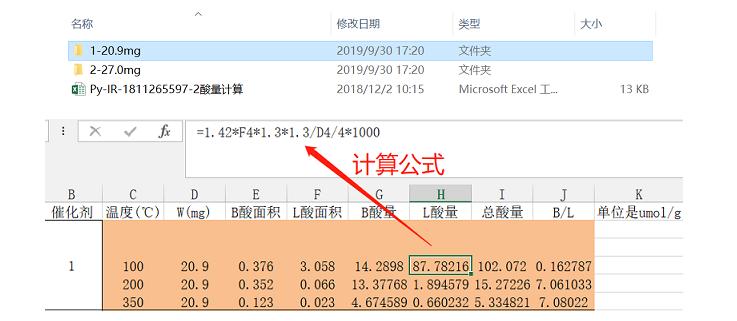 测试结果给出的是文件夹和excel表格。文件夹以样品编号和对应样品测试用量命名,里面给出对应红外谱图的原始数据和导出的excel数据,酸量计算的excel里面给出根据谱图峰面积归一化计算出来的相对酸量